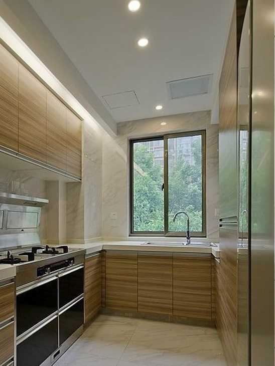 狭长型厨房要做好照明设计,不要阻挡窗户的采光,这样狭小的空间不至于太过幽暗。