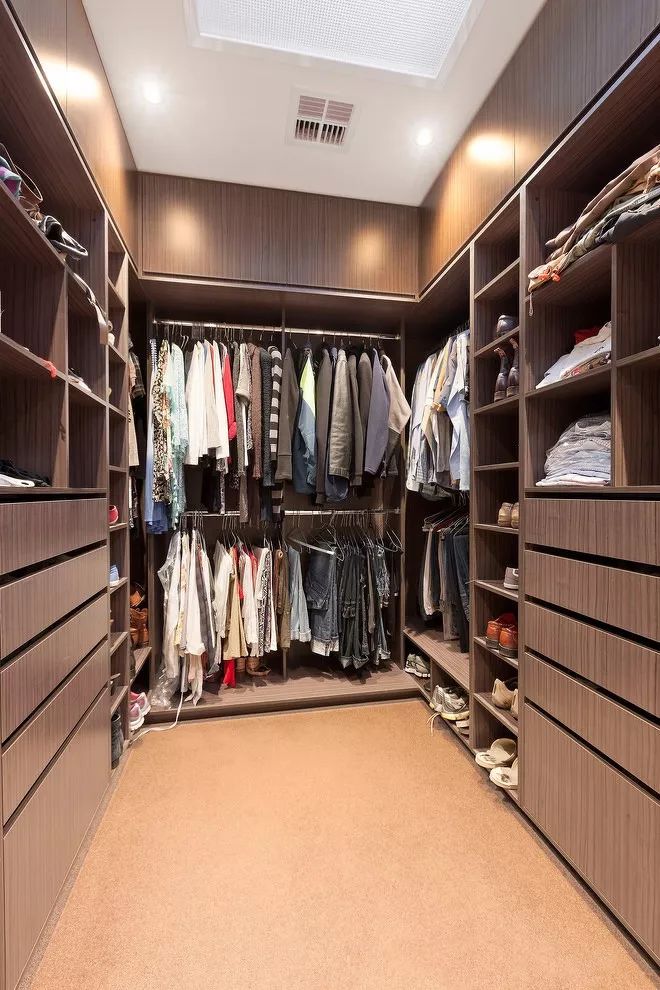 年轻夫妇的衣物是多样化的,一般将左右两边分别设置成男女方各自的储衣空间,柜体内的挂衣架通常分为长短两层分别储存大衣和上装,衬衫也可以放置于独立的小抽屉或搁板,不会因过多衣物挤压在一起而皱折难看。